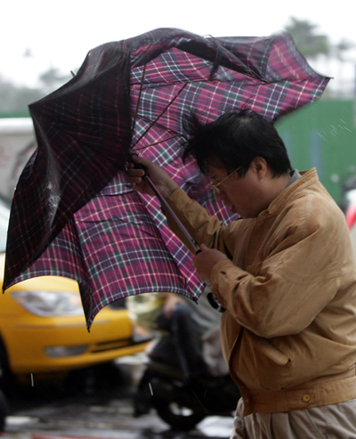 米塔臺風(fēng)二十六日下午已轉(zhuǎn)為輕度臺風(fēng),臺灣氣象部門預(yù)測米塔臺風(fēng)暴風(fēng)圈將會縮小,但外圍環(huán)流與鋒面共伴效應(yīng)為臺灣島北部及東部帶來的豪雨仍會持續(xù)。圖為行人在雨中艱難行進。“中央社”圖 張皓安 攝