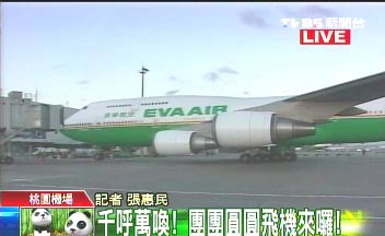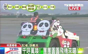 運(yùn)輸贈(zèng)臺(tái)大熊貓“團(tuán)團(tuán)”、“圓圓”的臺(tái)灣長(zhǎng)榮班機(jī)下午5時(shí)許抵達(dá)桃園機(jī)場(chǎng),圖為桃園機(jī)場(chǎng)的車輛被打扮成熊貓風(fēng)格。 臺(tái)灣TVBS圖