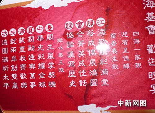 海基會為晚宴特制一份“藏頭詩”菜單:“江海歡騰彩滿堂/陳谷成偶展鴻圖/會合精英成佳話/談協(xié)論議寫歷史/臺閣生風(fēng)掌契機(jī)/中華光彩耀全球/圓潤融通興萬事/滿載豐收齊歡樂/成就兩岸創(chuàng)雙贏/功德圓滿祈太平”,以每句詩的頭一個字組成“江陳會談.臺中圓滿成功”。