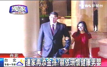 中新網(wǎng)2月1日電 據(jù)臺(tái)灣TVBS報(bào)道,連戰(zhàn)最快可能在今年7月就會(huì)抱到第2個(gè)金孫。據(jù)了解,連戰(zhàn)兒媳婦蔡依珊已懷孕4個(gè)月,嬰兒超音波初步顯示,胎兒是一名健康的男嬰,預(yù)產(chǎn)期在今年7月,極有可能生下一名“獅子寶寶”。