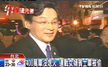 中新網(wǎng)5月1日電 據(jù)臺(tái)灣TVBS報(bào)道,國(guó)民黨榮譽(yù)主席連戰(zhàn)的女婿、連惠心丈夫陳弘元的奔馳車被偷,消息也登上新聞版面。陳弘元是和妹妹到新竹拜訪易經(jīng)老師,司機(jī)趁空檔,到超商繳費(fèi)而沒(méi)熄火的時(shí)候,原價(jià)400多萬(wàn)的奔馳車,被歹徒乘機(jī)偷開(kāi)走。