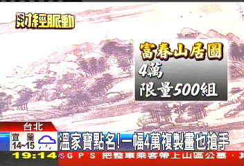 中新網(wǎng)4月24日電 據(jù)臺(tái)灣TVBS報(bào)道,2010臺(tái)北禮品展開(kāi)跑,臺(tái)北故宮今年第3次參展,也是規(guī)模最大一次。此次臺(tái)北故宮特別把溫家寶提過(guò)的富春山居圖制作成復(fù)刻板,限量500套,雖然一幅4萬(wàn)元(新臺(tái)幣,下同),但一開(kāi)賣就被訂走50套。