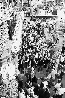 興濟(jì)宮還專設(shè)“宴王”,給予圣駕最高禮遇。數(shù)十平方米的大桌上有大龍蝦、烤乳豬等過百道各色食品。當(dāng)?shù)貙W(xué)生葉升融說起桌子正中最醒目的“山珍海味”,如數(shù)家珍,“用姜堆成的是‘山’,下面鋪著的紅豆綠豆代表了‘珍’,雪白的鹽就是‘!,‘味’則用紅糖表示!彼麑χ把缤酢辈粩喟磩涌扉T,說晚上就把照片傳到部落格上,和朋友們一起分享。 (記者 鄭璜 通訊員 林廣明)