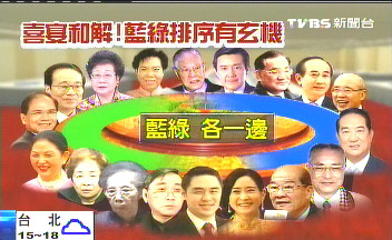 據(jù)報(bào)道,主桌最重要的位子是證婚人李登輝,再來是馬英九,順時針依序是連戰(zhàn)、王金平、吳伯雄、宋楚瑜、吳敦義、黃昆輝。而另一頭,李登輝夫婦旁邊,是呂秀蓮,民進(jìn)黨時代的“閣揆”張俊雄、游錫堃,藍(lán)綠雖然同桌,但壁壘分明,分坐兩邊。