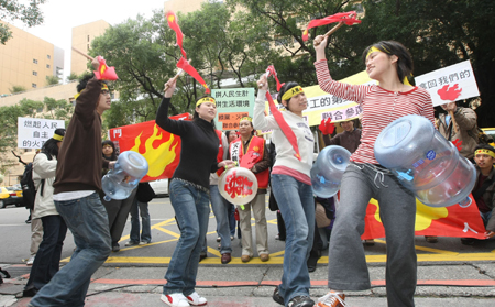 中新網(wǎng)11月20日電 據(jù)“中央社”報道,今天是臺灣地區(qū)“立委”候選人申請登記的截止日,綠黨與人民火大聯(lián)盟前往“中選會”登記不分區(qū)“立委”,在門前載歌載舞,敲打著水桶高喊“拼人民生計、拼生活環(huán)境”,諷刺當局治理無能。