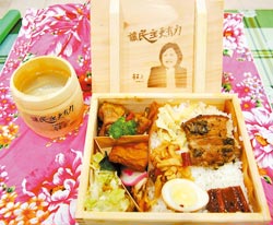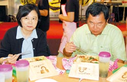 民進黨主席蔡英文(左)吃著印有自己肖像的便當(dāng)時,忍不住欣喜滿足,一旁的嘉義縣長陳明文也津津有味地品嘗。