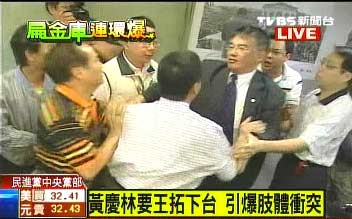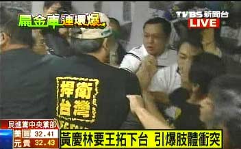 中新網(wǎng)10月13日電 民進黨秘書長王拓指陳水扁違反民進黨大是大非的一席話,不僅引起陳水扁反批,今日(13日)更在黨內(nèi)嚴重爆發(fā)分裂危機。民進黨臺北市黨部主委黃慶林上午前往中央黨部找王拓理論,雙方人馬當場就互相拉扯,爆發(fā)嚴重沖突。