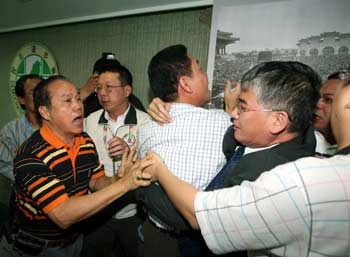 中新網(wǎng)10月13日電 民進(jìn)黨秘書長(zhǎng)王拓日前批評(píng)黨內(nèi)流行情義相挺的談話引發(fā)部分黨內(nèi)人士不滿。臺(tái)北市黨部主委黃慶林今天率眾到民進(jìn)黨中央抗議并要求王拓下臺(tái),中央黨部副秘書長(zhǎng)洪耀福接見(jiàn)時(shí)提及,“當(dāng)初第一個(gè)主張開除陳水扁的就是黃慶林”,此言立即引發(fā)沖突,黃慶林要求洪耀福道歉,但洪耀福拒絕。
