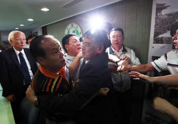 洪耀福代表接見(jiàn)時(shí)表示,用人是黨主席的權(quán)利,陳水扁海外匯款案發(fā)生至今,黨中央沒(méi)有說(shuō)過(guò)一句重話,黃慶林是第一個(gè)主張開除陳水扁,此語(yǔ)一出引發(fā)黃慶林不滿,場(chǎng)面混亂,黃慶林帶來(lái)的支持者與黨部人員發(fā)生扭打,最后洪耀福在黨工的保護(hù)下先行離開。