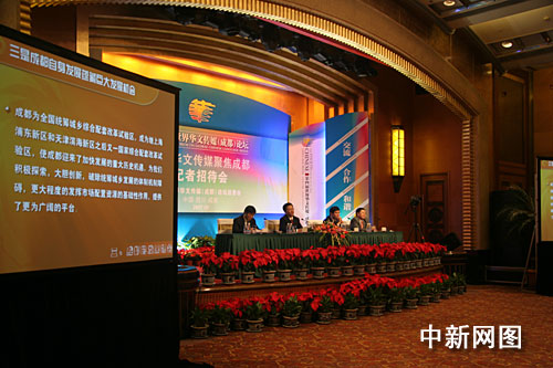 [中共成都市委常委、宣傳部長(zhǎng)郝康理]: 各位新聞界的朋友們,女士們,先生們,大家下午好。時(shí)值金秋九月,美麗的蓉城榮幸地迎來(lái)了第四屆世界華文傳媒論壇的舉行。為了讓廣大海外媒體更好地了解成都,今天我們專(zhuān)門(mén)在此舉行“世界華文傳媒聚焦成都”專(zhuān)題記者招待會(huì),由成都市領(lǐng)導(dǎo)向各位記者介紹成都市的基本情況,以及成都市舉辦本屆世界華文傳媒論壇的相關(guān)情況。出席今天記者招待會(huì)的領(lǐng)導(dǎo)有:中共成都市委副書(shū)記、成都市市長(zhǎng)葛紅林先生;成都市委常委孫平先生,成都市副市長(zhǎng)何華章先生,以及成都市發(fā)展改革委員會(huì)、投資促進(jìn)委員會(huì)、商務(wù)局等部門(mén)的負(fù)責(zé)人。除了參加本屆論壇的海外記者出席記者招待會(huì)外,還有國(guó)內(nèi)外眾多的媒體記者參加招待會(huì),在這里向大家表示熱烈的歡迎。為了讓第一次光臨成都的媒體朋友充分了解成都,首先請(qǐng)大家看張藝謀導(dǎo)演拍攝的宣傳片,《成都—一座來(lái)了就不想離開(kāi)的城市》。 |