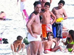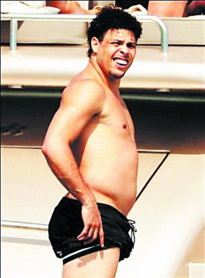 因?yàn)榇饲癆C米蘭一直對(duì)他能否留隊(duì)舉棋不定,世界杯又被鄧加拋棄,小羅只好自己去尋開(kāi)心,他先是相約帕托等人在奢華酒店享受,隨后又到里約熱內(nèi)盧沙灘玩耍。只是他忘了給自己的大肚腩遮羞,臃腫的身材似乎正在向大羅看齊。