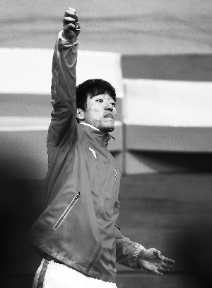 換鞋、脫衣服、換衣服———黑色T恤換成了白色T恤,上面印著劉翔的跨欄頭像。劉翔跨欄試跑后,兩手做出“六”的姿勢,感覺不錯(cuò)的“飛人”喝了點(diǎn)礦泉水。隨后,劉翔扭扭脖子,活動活動筋骨,再脫掉訓(xùn)練服,換上比賽服。