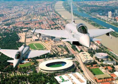 奧地利空軍為確保歐洲杯期間主賽場的安全,派出最新裝備的EF2000“陣風(fēng)”式戰(zhàn)斗機執(zhí)行空中巡邏任務(wù),以確保比賽的安全。