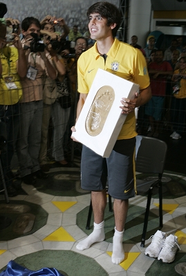 昨日,正隨巴西國家隊備戰(zhàn)世界杯預(yù)選賽的卡卡抽空在著名的里約熱內(nèi)盧馬拉卡納足球場參加一個名人紀(jì)念館活動。在那里,前世界足球先生和金球獎得主卡卡留下了自己的“足跡”,米蘭頭號球星正式成為馬拉卡納足球場名人堂的成員,也是第94位進入這一名人堂的足球名人。