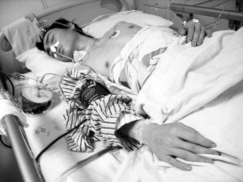 12月9日上午,記者在中國醫(yī)科大學(xué)附屬第一醫(yī)院重癥監(jiān)護(hù)室,看到身受重傷的王某仍躺在病床上接受著治療。據(jù)王某的母親介紹,王某今年22歲,原是遼寧某足球隊(duì)一名球員。今年年初時,因?yàn)榧抑薪?jīng)濟(jì)條件不是太好,再加上外面還有許多債務(wù),無力供王某繼續(xù)踢球,王某被迫從球隊(duì)回到家中。眼下,家中正托人幫著孩子尋找工作,可工作沒有找著孩子便出了事。