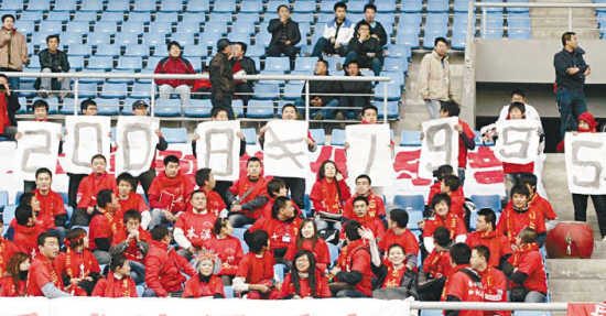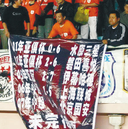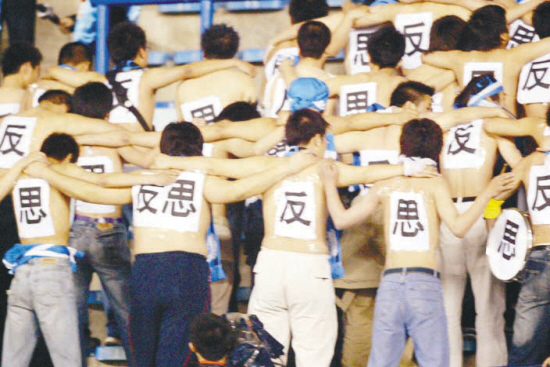 大連不愧為中國(guó)的足球城。2006年5月21日,一群大連球迷在看臺(tái)上光起膀子,背后貼滿了“反思”,這是中國(guó)球迷最真切的想法。可惜,中國(guó)足球沒(méi)有停止過(guò)反思,只是很少采取行動(dòng)。