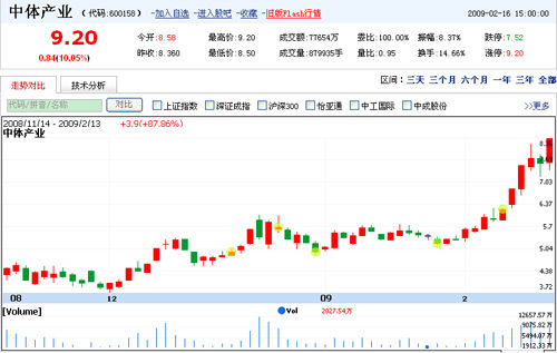 又漲停了!昨天(2月16日)下午,中體產(chǎn)業(yè)(600158)以9.20元漲停收盤,這已經(jīng)是該股近6各交易日以來第5次漲停,不少被套牢的股民終于解套,并稱是謝亞龍解放了他們。由于前中國足協(xié)專職副主席謝亞龍將于2月26日入主中體產(chǎn)業(yè)董事會,因此筆者在中體產(chǎn)業(yè)股吧注意到,不少股民從一開始臭罵和惡搞謝亞龍,轉(zhuǎn)變成了感謝。