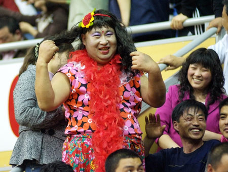 “如花”顯然是有備而來(lái),他戴著花圍巾、穿著花衣裳,賽前先是戴著一個(gè)黑色的發(fā)套現(xiàn)身。比賽中他還到洗手間重新打扮,換上紅藍(lán)相間的發(fā)套再回到賽場(chǎng)。據(jù)當(dāng)?shù)孛襟w記者介紹,這個(gè)球迷是江蘇舜天隊(duì)的鐵桿球迷,大家都稱他“胖哥”。在足球場(chǎng)上,這個(gè)球迷也是如此打扮為江蘇舜天隊(duì)加油,看到舜天本周沒(méi)有比賽,他就到籃球賽場(chǎng)上來(lái)“湊熱鬧”了。(記者潘天舒)