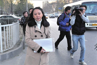 昨天下午1點25分,陸幽出現(xiàn)在朝陽法院當(dāng)事人入口,她身穿米色大衣。由于此前陸幽已以案件和證據(jù)都涉及到個人隱私為由,向法院提交不公開開庭審理的申請,因此昨天她并沒有戴墨鏡,以至于見到記者她很吃驚。在法院大廳進(jìn)行安檢時,陸幽的臉一直扭向墻壁。