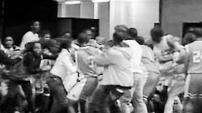 現(xiàn)場(chǎng)攝像機(jī)鏡頭記錄下的畫面極其火爆:身著比賽服的球員和球迷扭打在一起,旁邊的女拉拉隊(duì)員也加入到混戰(zhàn)當(dāng)中。戰(zhàn)火從球場(chǎng)一直燒到了看臺(tái)上,替補(bǔ)席上的一排椅子也不幸成為了受害者。聞?dòng)嵹s來(lái)的警察強(qiáng)拉硬拽,才把頭腦發(fā)熱的打架者一一制服,情節(jié)嚴(yán)重的人則被戴上手銬帶離了現(xiàn)場(chǎng)。