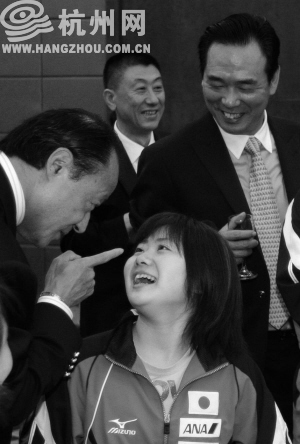本報訊 因?yàn)槎萝,趕到杭州天馬大酒店時晚點(diǎn)了,“小愛等了你一刻鐘”,福原愛的教練鄭慧萍透露:小愛隨日本隊(duì)下樓赴歡迎晚宴去了,“別急,我來安排”。