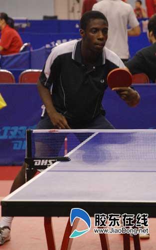 地球人都知道,世界高水平的乒乓球運(yùn)動(dòng)員都集中在東亞和歐洲,乒乓球幾乎與黑人運(yùn)動(dòng)員絕緣。據(jù)說,這是因?yàn)楹谌说募∪忸愋秃蜕窠?jīng)類型不適應(yīng)這項(xiàng)運(yùn)動(dòng)。不過今天上午記者在比賽現(xiàn)場(chǎng)看到了一位地道的黑人選手正與中國運(yùn)動(dòng)員對(duì)練,而且水平不低,打得有聲有色,稀奇,稀奇。