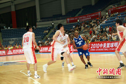 5月7日,周五的晚上,2010年中美明星籃球賽在浙江杭州黃龍?bào)w育館開(kāi)賽。和姚明搭檔過(guò)的卡爾-蘭德里,拿過(guò)NBA總冠軍的“手套”佩頓,代表美國(guó)國(guó)家隊(duì)拿過(guò)奧運(yùn)會(huì)金牌的里奇蒙德……賽前,主辦方的宣傳詞句中,不乏璀璨的光環(huán)。