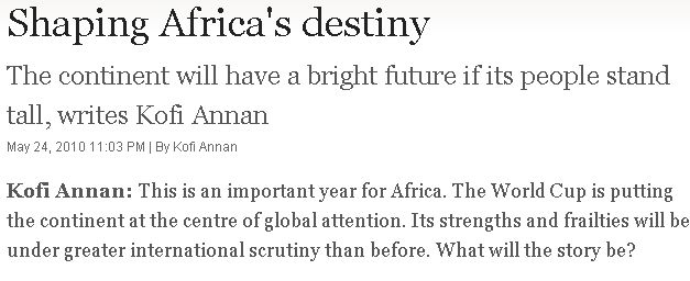 中新網5月25日電 前聯(lián)合國秘書長科菲•安南日前在南非《星期日時報》上刊文,分析即將開幕的2010年世界杯對南非乃至非洲的重要意義。他認為,通過舉辦這屆世界杯,如果這個大洲的人民能夠高高站起,非洲或將改變其命運,迎來光明的未來。