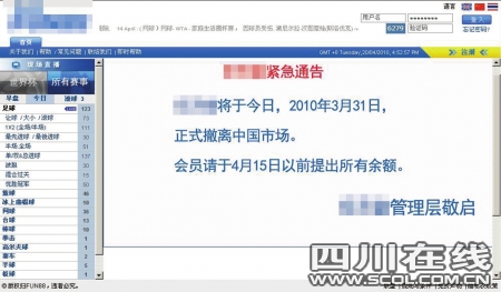 在另外一家博彩網(wǎng)站,同樣是存款界面,中國(guó)國(guó)內(nèi)借記卡的一欄已經(jīng)成了空白,付款只能通過點(diǎn)擊國(guó)外信用卡才可以進(jìn)行,包括國(guó)內(nèi)雙幣信用卡也不能使用。此外,還有一家網(wǎng)站竟然掛出了公告,于“2010年3月31日正式撤離中國(guó)內(nèi)地”。