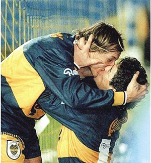 阿根廷人的豪放這一刻展現(xiàn)得淋漓盡致,主角是球王和風(fēng)之子。當(dāng)時(shí)風(fēng)之子接到球王的妙傳破門(mén)得分,兩個(gè)人當(dāng)場(chǎng)不顧全場(chǎng)所有觀眾和其他的隊(duì)友激吻在一起,長(zhǎng)達(dá)6分鐘,而且還是“舌吻”!當(dāng)時(shí)引起了全世界的轟動(dòng)!好戲還在后頭:卡尼吉亞的老婆說(shuō):“馬拉多納是同性戀,他喜歡親吻卡尼吉亞的嘴唇!碑(dāng)然老馬很生氣,但是他表示:“看在卡尼吉亞的份上就不追究了!”