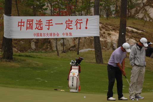 中新網(wǎng)首爾9月25日電 (張哉麟) 2009“韓國KEB銀行”中韓職業(yè)高爾夫球巡回賽韓國站比賽今日在韓國OSTAR高爾夫球俱樂部繼續(xù)進(jìn)行,球場邊有橫幅上面用中文寫著“中國選手一定行!”,有工作人員還在這橫幅面前,與中國選手合影留念。