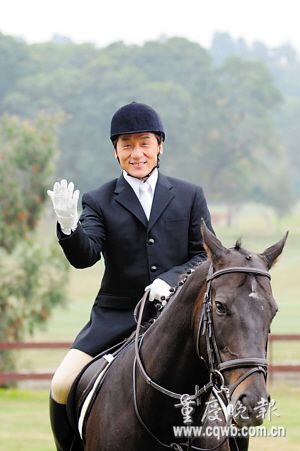 盡管成龍?jiān)诒娙诵哪恐械男蜗蟾嗍且晃还Ψ蛎餍,不過追星族近期看到他穿起馬靴、戴起馬帽化身馬術(shù)騎士,代言今年夏天在中國香港舉行的奧運(yùn)馬術(shù)賽!2008年在奧運(yùn)馬術(shù)賽城市——香港見,”身著一身騎師裝束的成龍說,他同時(shí)在鏡頭前抓著一匹漂亮黑馬的韁繩。