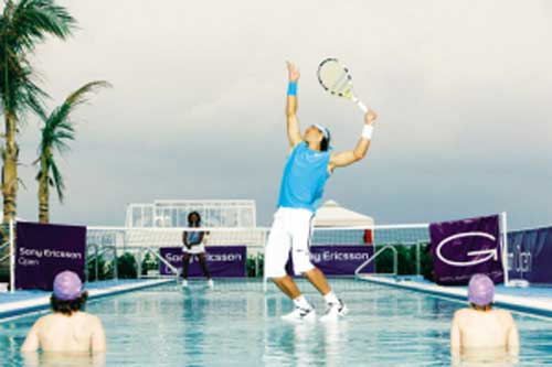 索尼愛(ài)立信公開(kāi)賽即將大幕重開(kāi),網(wǎng)壇兩位巨星級(jí)人物納達(dá)爾和小威廉姆斯有幸親歷了一番別樣的打球體驗(yàn)。本月24日,他們?cè)谶~阿密當(dāng)?shù)谿ansevoort South 酒店的屋頂上打了一場(chǎng)別樣的網(wǎng)球賽,更有意思的是他們“站”在水上打球。