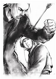 “電腦技術(shù)能很好地解決毛筆技法較難處理的地方”,光祖說,“而且電腦上色快,易修改,效率高 ,有問題可以馬上解決,便利性強。在決定用水墨技法以后,我們用了較長的一段時間去用電腦體現(xiàn)毛筆的感覺,剛開始的時候還遇到不少困難,還好到最后還是解決了。”他說:“所有的連載都是用毛筆作底稿,后期再用電腦去潤色,增強國畫效果。在創(chuàng)作初期,毛筆的底稿是必要的,漫畫所有的基調(diào)還是要一筆一劃畫出來,而后期的潤色,則用電腦,這樣互相配合,才能充分發(fā)揮兩者的優(yōu)點嘛!