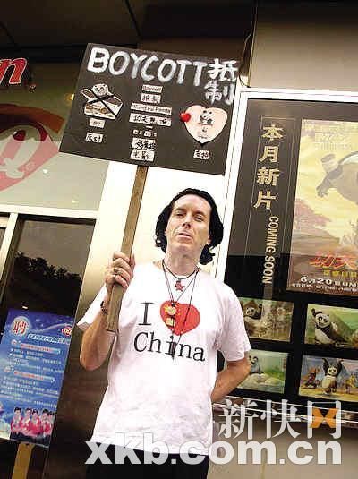 一位網(wǎng)友在他的博客中介紹了事情的經(jīng)過(guò):“在北大教書(shū)的美國(guó)人Tim Lies和他的中文翻譯日前來(lái)到位于北京北三環(huán)的華星國(guó)際影城,手舉著一個(gè)寫(xiě)著‘BOY-COTT 抵制’的牌子開(kāi)始了他抵制好萊塢電影《功夫熊貓》的實(shí)際行動(dòng)。他希望中國(guó)電影不要變成第二個(gè)好萊塢!