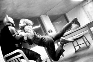 還是在審問期間,“蝙蝠俠”和“小丑”互相糾纏在一起,前者的雙手掐住了后者的頭頸。當(dāng)時(shí)采取了不同機(jī)位拍攝特寫,從一個(gè)角度來看,“小丑”從“蝙蝠俠”的手臂下方抓住他,但從另一個(gè)角度來看,“小丑”的手臂卻占據(jù)了上風(fēng),搭在“蝙蝠俠”手臂之上。