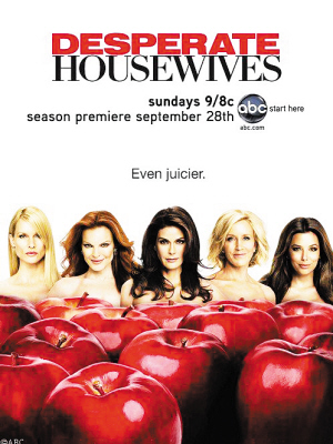 《絕望的主婦》第五季宣傳海報(bào)日前曝光。海報(bào)延續(xù)了前季的“主婦與蘋果”的創(chuàng)意,不過這次五位主婦裸露香肩,隱身于一堆蘋果后面,極盡誘惑!督^望的主婦》第五季將于9月28日回歸。
