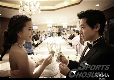 新郎樸周永畢業(yè)于漢陽大學(xué)法律系,是韓國中堅建設(shè)企業(yè)樂山集團總裁樸成寬的次子,現(xiàn)在首爾江南狎鷗亭洞經(jīng)營美容公司。去年,金喜善經(jīng)熟人介紹在一次聚會上和樸周永相識后,兩人經(jīng)過一年多的甜蜜戀愛,終于修成正果。