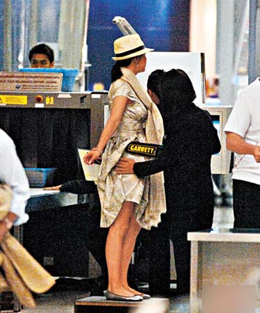 劉嘉玲和梁朝偉昨日凌晨由曼谷機(jī)場(chǎng)轉(zhuǎn)飛不丹,臨上機(jī)前二人如普通旅客一般,要經(jīng)過(guò)金屬探測(cè)機(jī)測(cè)試,未料嘉玲過(guò)關(guān)時(shí)竟發(fā)出BB聲響,女關(guān)員即上前一手拿 金屬探測(cè)儀器,一手摸嘉玲腰胸搜身,而嘉玲非常合作,自動(dòng)脫掉帽子,挺直腰板任由女關(guān)員檢查,最后安然過(guò)關(guān)開心上機(jī)。