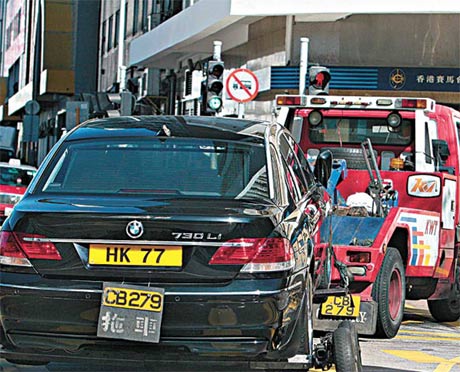 掛上紀念朱玲玲當選港姐年份HK77車牌的寶馬,昨日也被拖車拖到寶馬車廠。