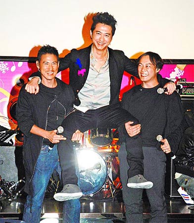 哈林(中)用工作療傷,昨發(fā)片記者會,好友張學友(左)、陳奕迅力挺同臺演唱