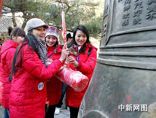 最后,模特與“潭柘寺2008國際職業(yè)模特大賽中國總決賽”組委會人員、門頭溝區(qū)領(lǐng)導(dǎo),在寺內(nèi)撞響古鐘。