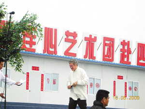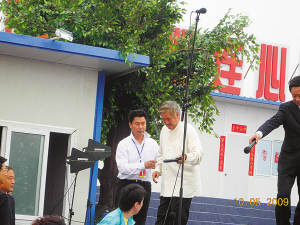 雖然本次“心連心”藝術團在明星陣容上創(chuàng)下了空前的紀錄,但是劇組在籌備過程中卻是對成本極盡節(jié)約。昨日早上6點半,記者提前來到演出現(xiàn)場,碩大一個舞臺就搭建在板房區(qū)的一個空地上,舞臺背景也是就地取材,由幾間貼著大紅對聯(lián)的板房組成,但看著特別的溫暖。
