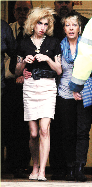 美國有“癲后”布蘭妮長期霸占娛樂版面,英國則有“毒后”艾米·懷恩豪斯制造新聞點。上周五她在審訊結(jié)束前5分鐘趕到法庭,為被控傷人及行賄等罪名的25歲老公Blake打氣,還公然于庭上高喊:“老公我愛你!你是最靚仔有型的!”送給Blake一顆定心丸,有目擊者就表示,Blake隨即以口形回應(yīng):“你怎樣啦?”艾米只懂不斷重復(fù):“愛你!愛你!”恩愛得旁若無人。不過艾米當(dāng)天邋遢異常,蓬頭垢面甚至穿著殘舊芭蕾舞鞋就來到法庭了。