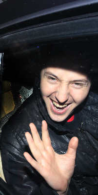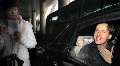 昨日下午從2點多開始,機場大廳就陸續(xù)出現(xiàn)前來接機的歌迷。數(shù)十名鐵桿粉絲裝備齊全,有的手捧鮮花,有的拉開寫著俄語“歡迎回家”字樣的橫幅。15點56分飛機抵達機場,數(shù)分鐘內,Vitas就飛速地從出口走出,黑夾克黑褲子的他雖然衣著低調,還是被眼尖的歌迷認出,接著機場大廳迅速充斥著呼喊Vitas名字的尖叫聲。眼見歌迷的熱情,Vitas友善地用中文回應大家:“我愛你們!”短短四個字令歌迷更加瘋狂。有人甚至沖破層層障礙沖到Vitas身邊,把鮮花送予其手中,獻花成功的該歌迷立刻引來其他人的羨慕眼光。Vitas行色匆匆地走至停車場,露臉不過短短幾分鐘后,鉆進了黑色寶馬車內。臨走前,他一個轉身,朝剛才護駕的歌迷送出一個飛吻。