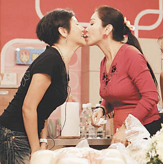 藍(lán)心湄(左)為陳美鳳慶生,兩人在錄影現(xiàn)場“玩親親”。