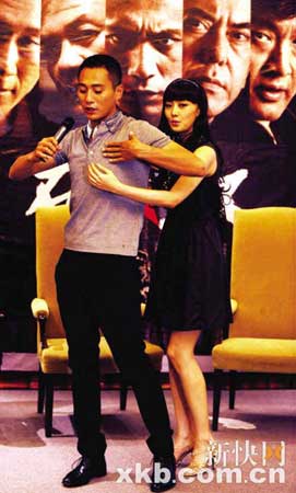 除了增重,劉燁還要犧牲色相。片花中他有一個背部全裸的鏡頭,劉燁說那個屁股真的是他的。而他和女主角還有一場在浴室里擁抱的戲。女主角劉洋說,因為劉燁那時候很大只,所以她兩只手還抱不過來,但現(xiàn)在就很容易一下子抱過來了。主持人趁勢就要求她現(xiàn)場示范一下,劉洋果然就從背后對劉燁“深情擁抱”,引來現(xiàn)場閃光燈一片。