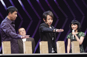 還是春晚那身打扮,劉謙不停給場下高呼他名字的粉絲放電,引發(fā)了一陣陣的尖叫聲。第一次上場,劉謙就用紙巾變成了一條彩帶,并讓彩帶從空中飛出去,把康洪雷導(dǎo)演接到了臺上。不過這只是略施小技,為了考驗(yàn)康洪雷手下的膽量,劉謙用了五個(gè)紙盒,當(dāng)著眾人的面在其中一個(gè)中藏了一個(gè)破碎的啤酒瓶,然后讓演員們用力去擊打。還好,經(jīng)過劉謙的“施法”,最后并沒有一人受傷,不過倒把現(xiàn)場觀眾嚇出一身冷汗。最后,劉謙把兩個(gè)“團(tuán)”字變成了一張《我的團(tuán)長我的團(tuán)》的海報(bào),就完成自己的這次走穴任務(wù)。