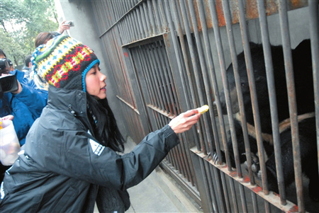 莫文蔚2004年3月成為亞洲動(dòng)物基金“拯救黑熊愛心大使”,隨后,只要她到成都,一定要抽出時(shí)間前往黑熊救護(hù)中心。這次來成都參與震后的公益慈善活動(dòng),莫文蔚昨日一大早就來到了救護(hù)中心!皩氊悆骸笔2005年初莫文蔚認(rèn)養(yǎng)的一只取膽黑熊,經(jīng)過工作人員4年的精心照料,“寶貝”早已康復(fù)。當(dāng)莫文蔚來到“寶貝”的喂養(yǎng)間時(shí),“寶貝”似乎認(rèn)識(shí)恩人,一看到莫文蔚就活蹦亂跳。莫文蔚也開心不已,還把特意帶來的水果蘸上蜂蜜喂給“寶貝”(上圖)。昨日莫文蔚還看望了最新救助的12頭黑熊以及棕熊“凱撒”,一路上笑聲不斷。