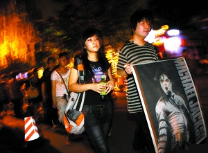 昨晚,歌迷手持邁克爾·杰克遜的照片繞后海行走,悼念這位樂壇巨星。美國流行樂壇巨星邁克爾·杰克遜25日因心臟病發(fā)作在洛杉磯一家醫(yī)院不治身亡,終年50歲。為確認杰克遜的死因,洛杉磯驗尸官今日將進行尸檢。